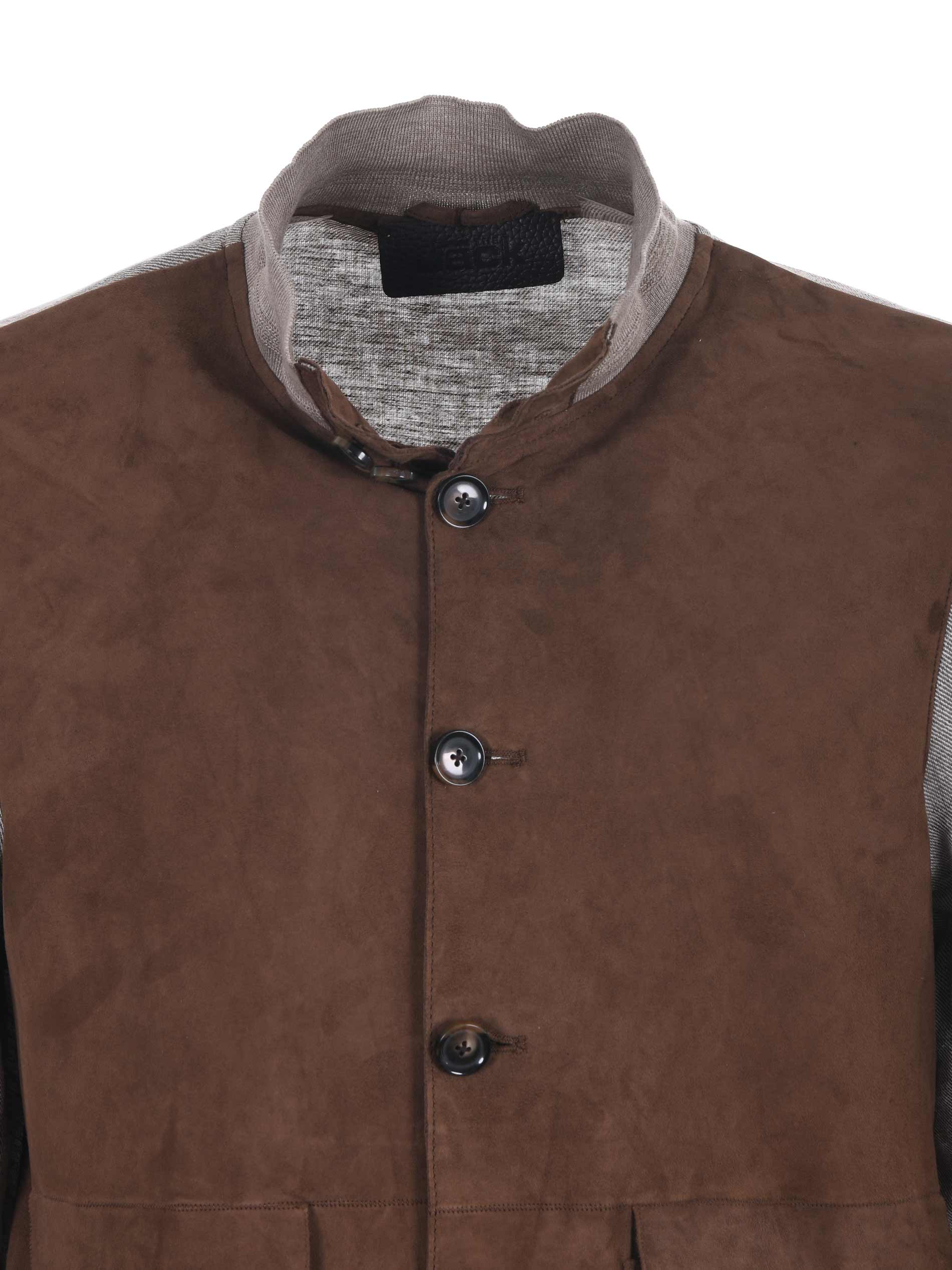 Giubbotto The Jack Leathers in pelle scamosciata Marrone. Maniche e pannello posteriore in twill di lino e cotone Beige. Collo alto in maglia a costine. Tasche frontali a doppia entrata. Polsi e fondo in maglia a costine. Chiusura con bottoni a vista. Interamente sfoderato e decostruito.