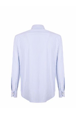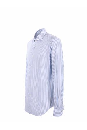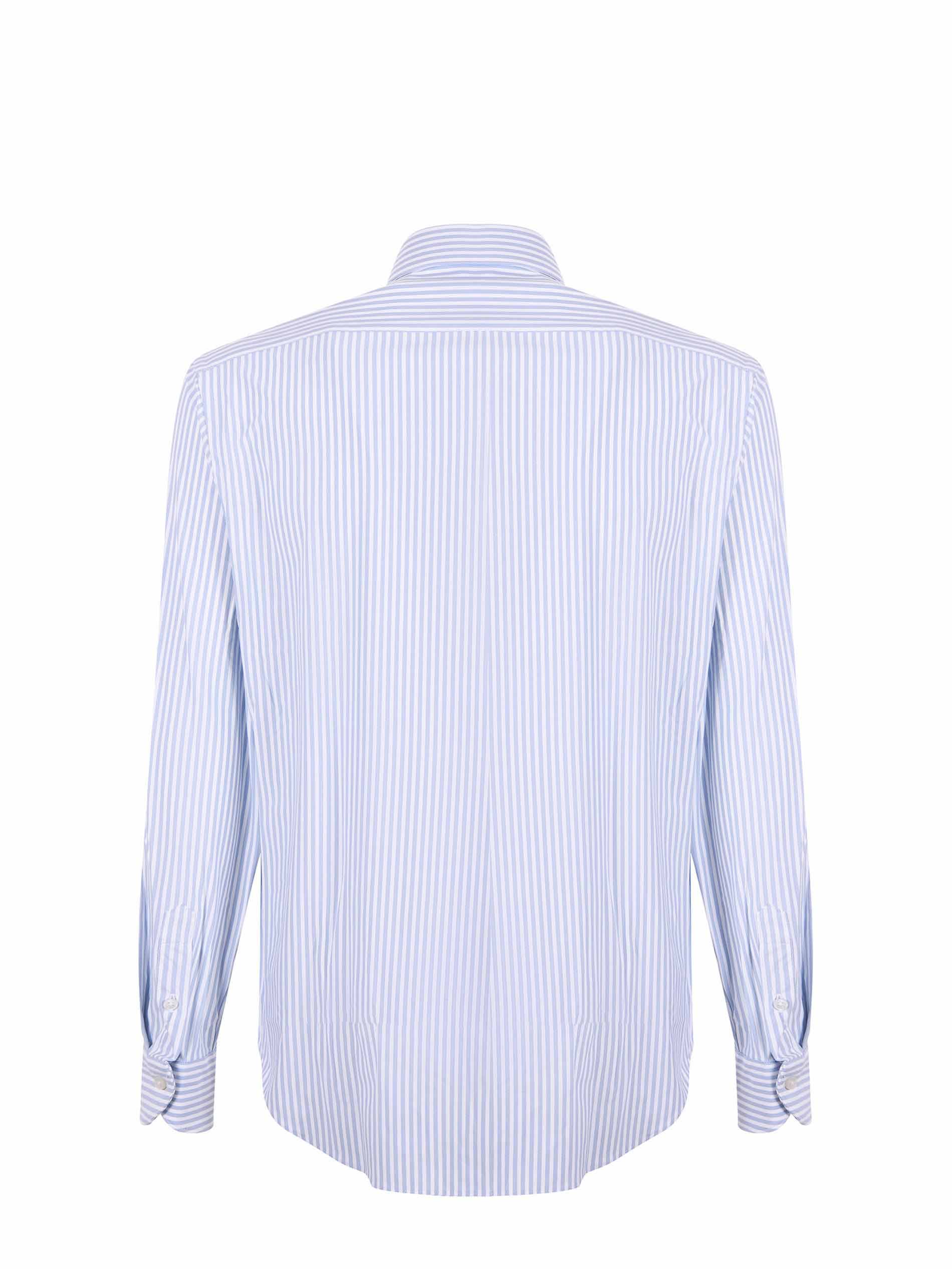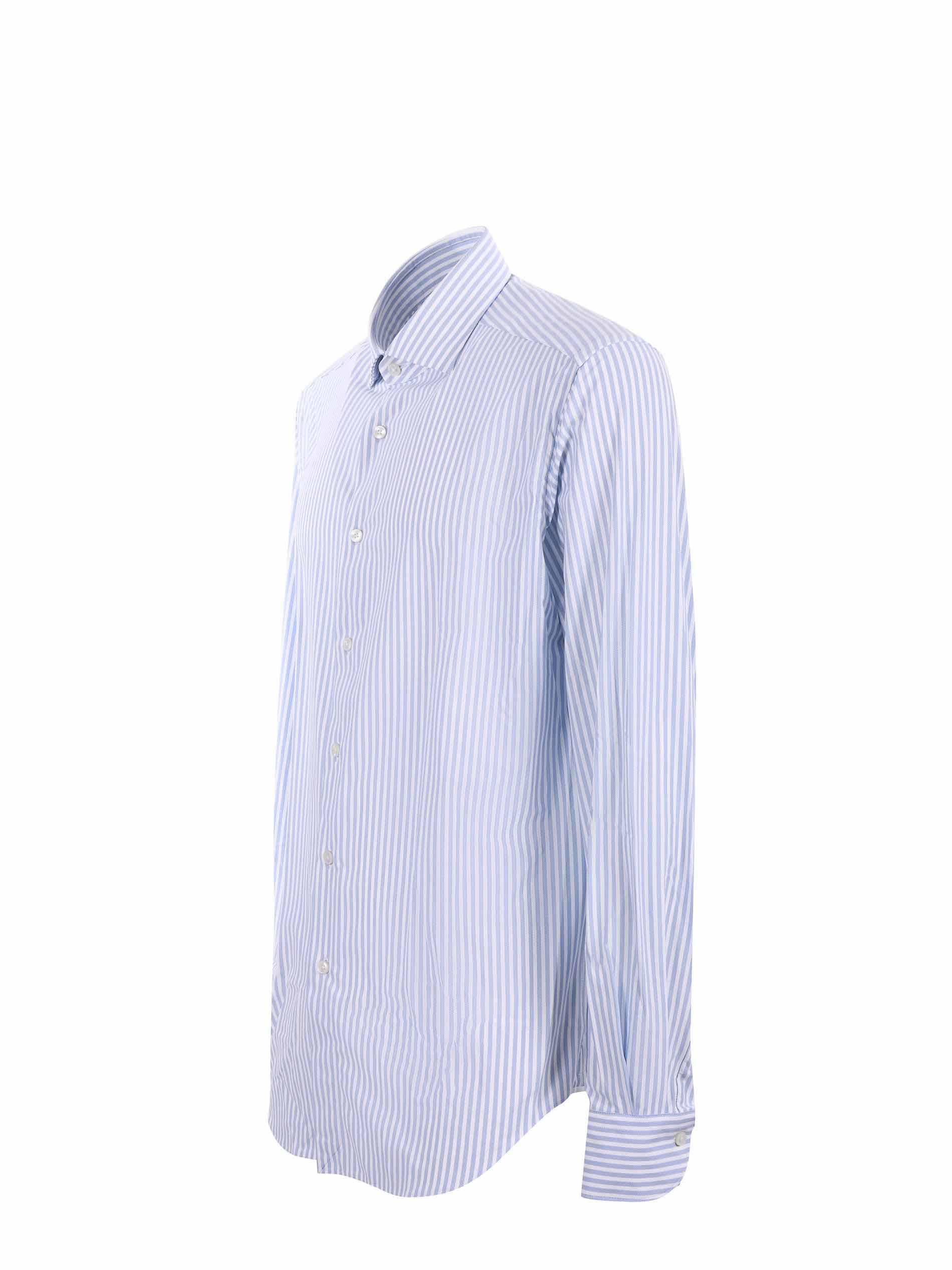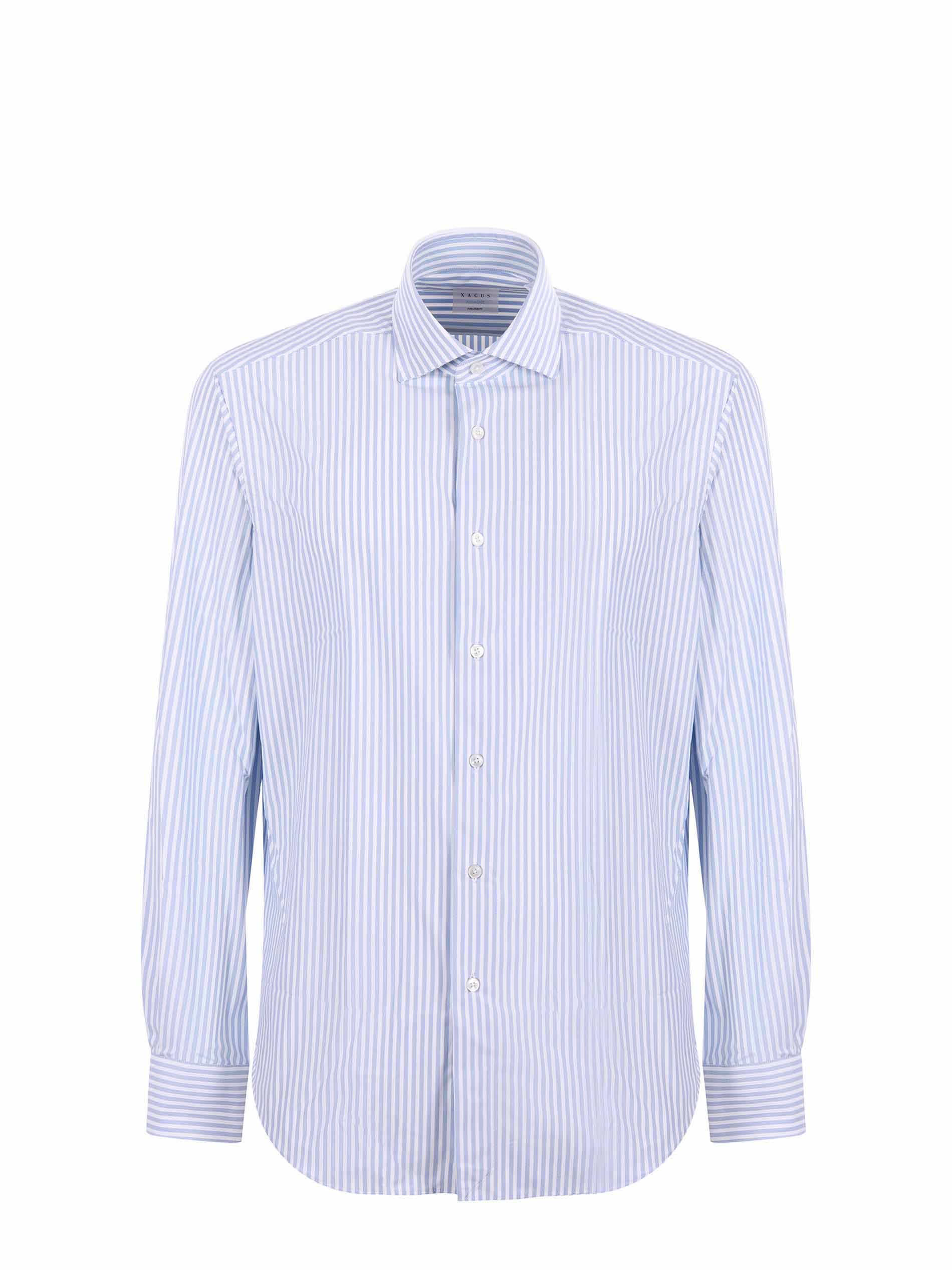 Camicia Xacus in jersey stretch motivo righe pari Azzurro/Bianco. Collo francese. Chiusura con bottoni. Manica lunga. Polso con bottone.