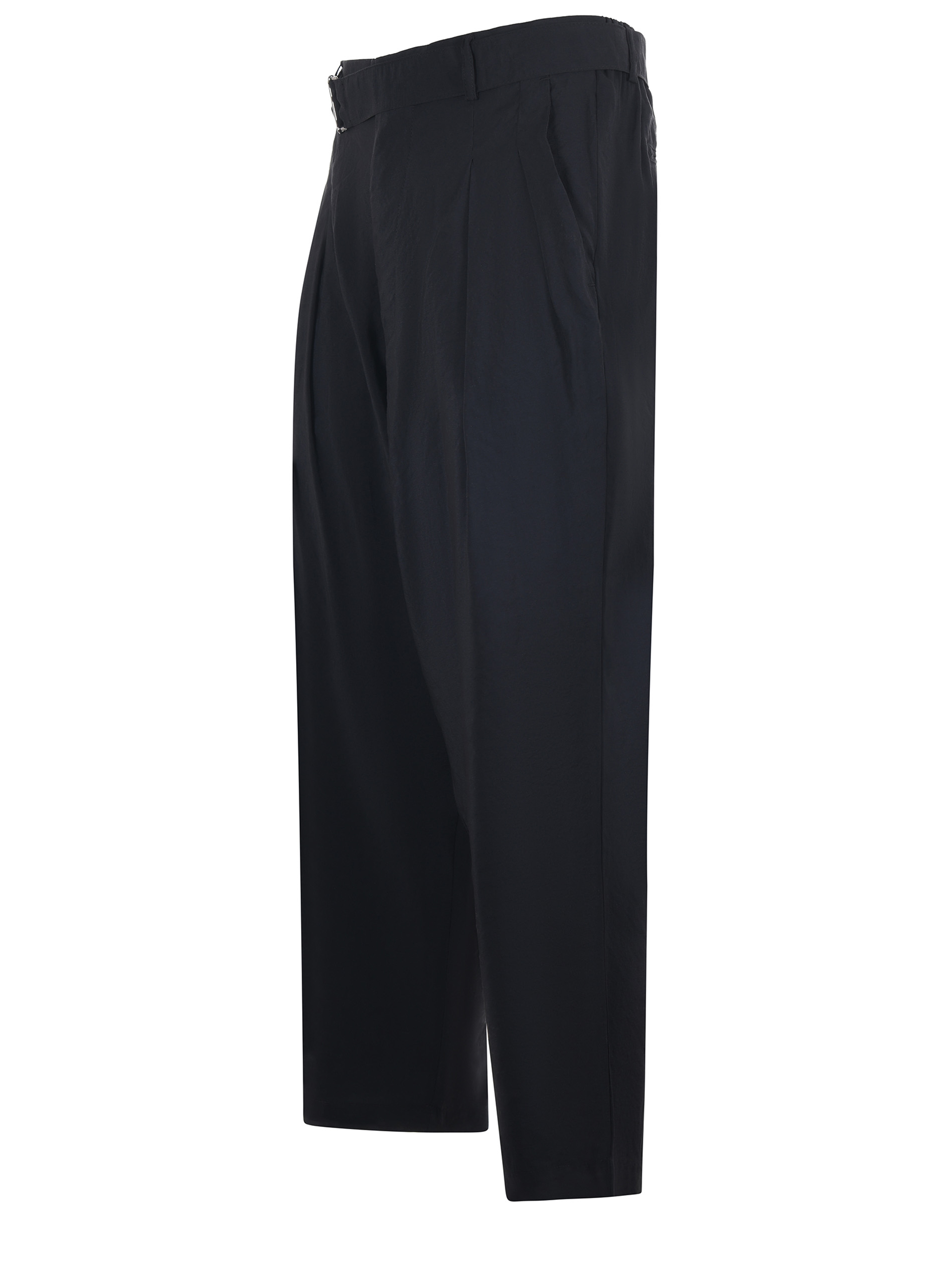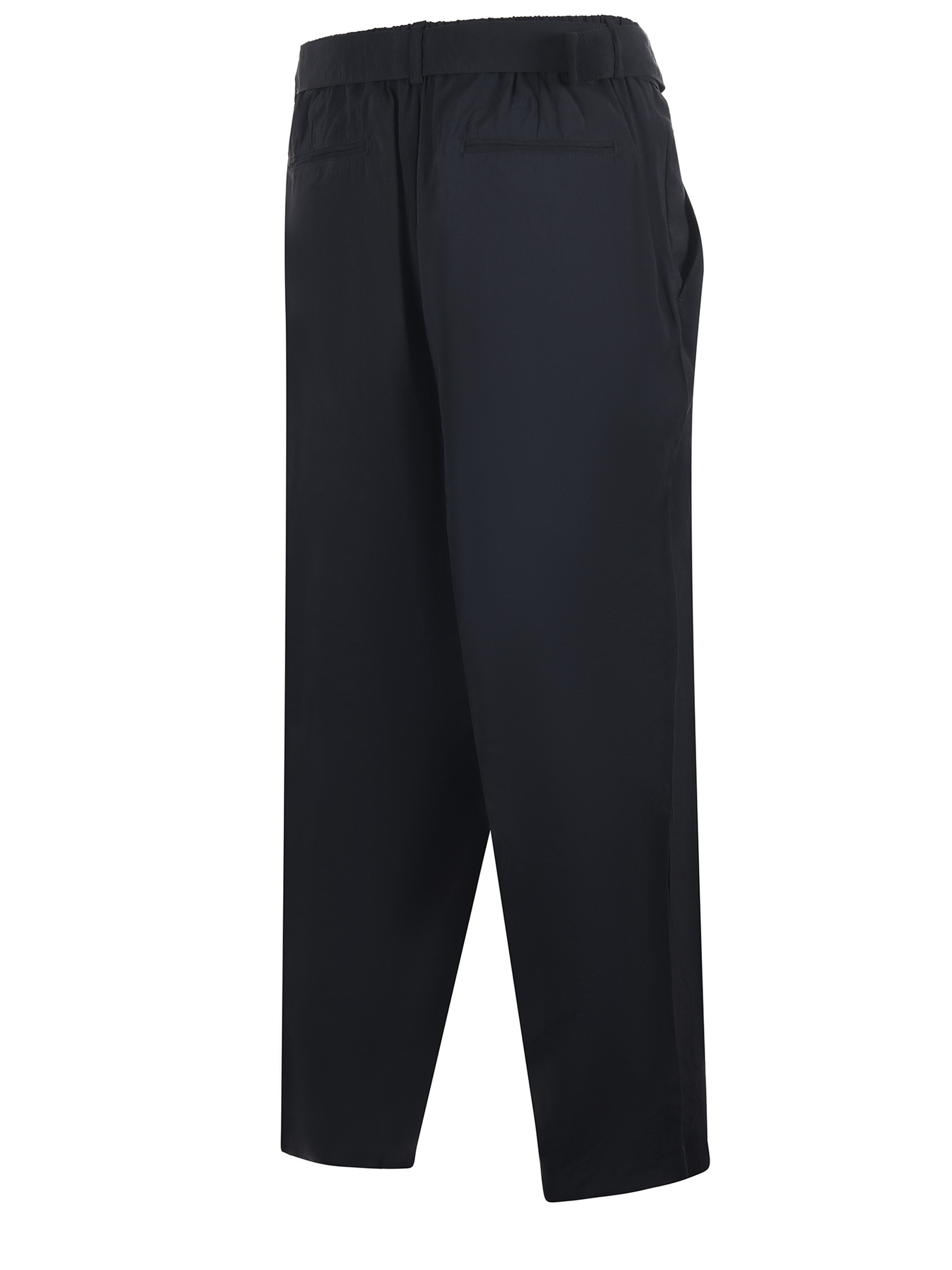 Pantalaccio Yes London in tecno cotone Nero effetto manopesco. Pinces frontali. Inserto elastico in vita. Cintura abbinata removibile. Tasche america. Tasche posteriori a filo. Chiusura con zip e bottone.