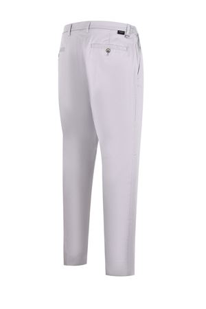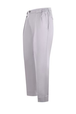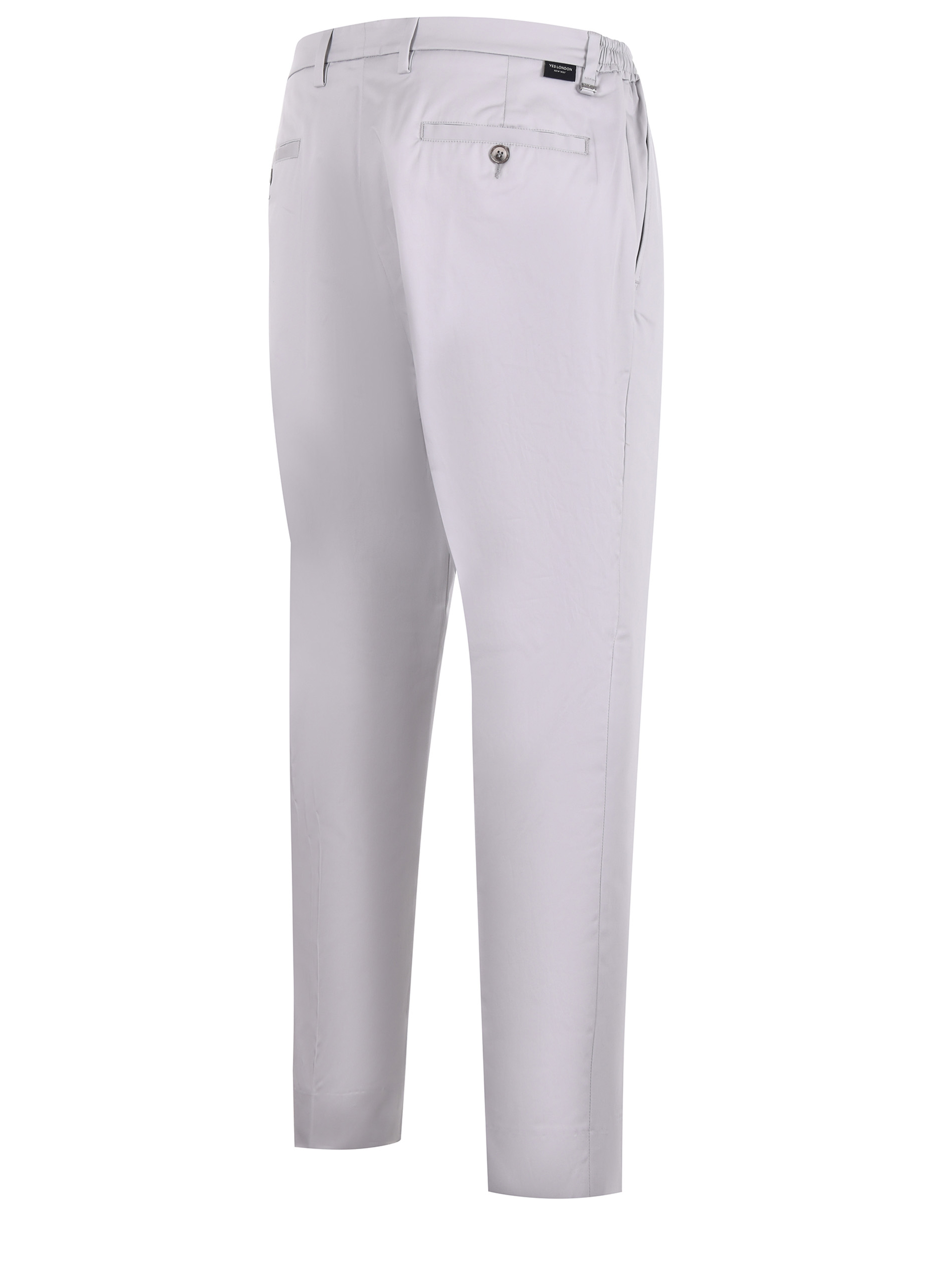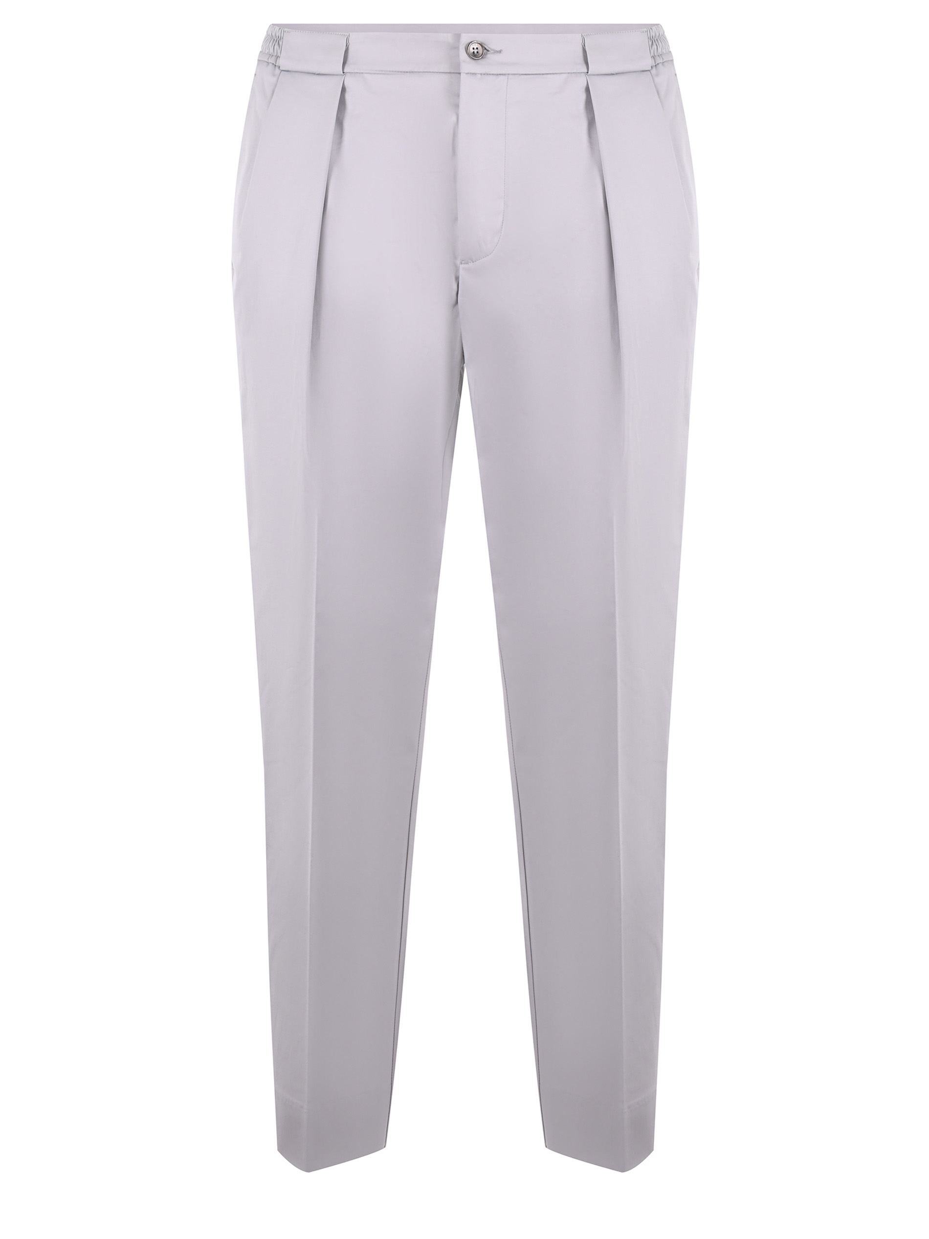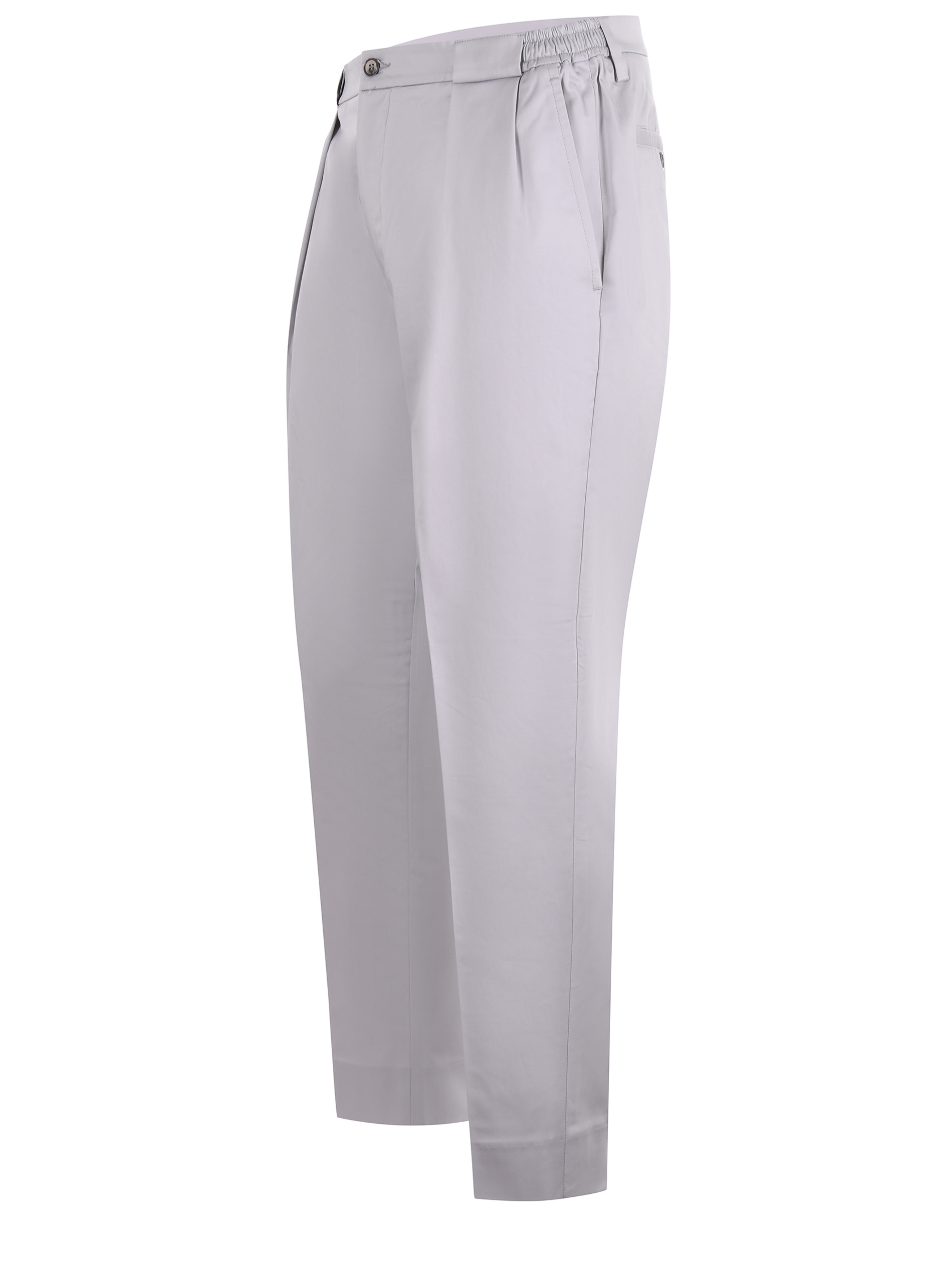 Pantaloni Yes London in cotone stretch color Ghiaccio. Pinces frontali. Inserto elastico in vita. Tasche america. Tasche posteriori a filo con bottone. Chiusura con zip e bottone.